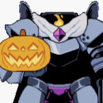 A royal knight who rides upon a skeleton unicorn pony. Both prideful, and judgmental to those around her unless they meet her standards of what it takes to be a true Nobel. Easily deceived, but ever vigilant to see her task through to the end as long as dirt does not touch her armor. Thinks highly of herself, and looks down on those below her ranks. Holding a jack-o-lantern as a head she has the ability of far sight, and wields an arsenal of weapons such as a throwing axe, and a whip made out of a human spine.